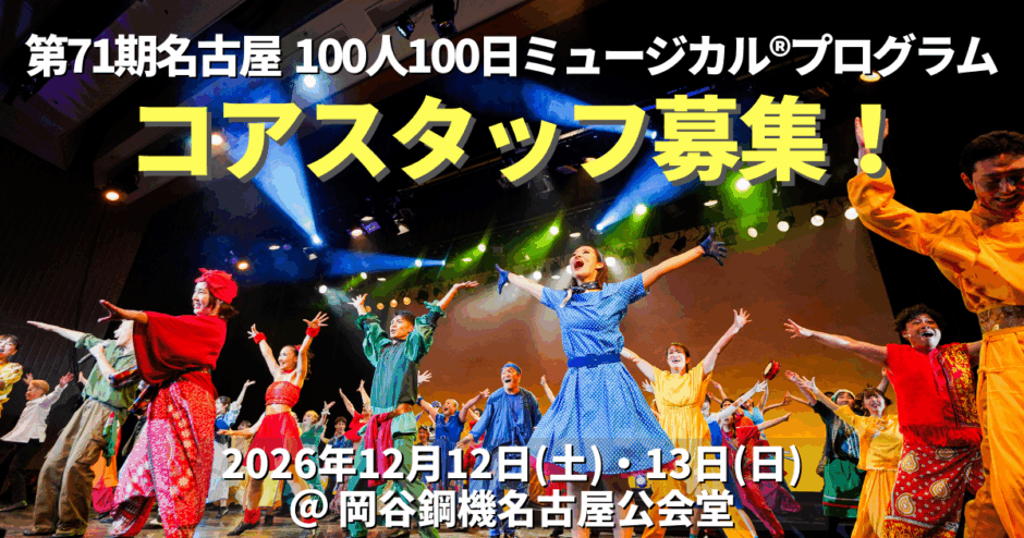 2026年9月開幕・12月公演の第71期名古屋100人100日ミュージカル®︎プログラムを中心となって創っていくコアスタッフ(アシスタントプロデューサー/演出/キャストキャプテン)募集のお知らせです。